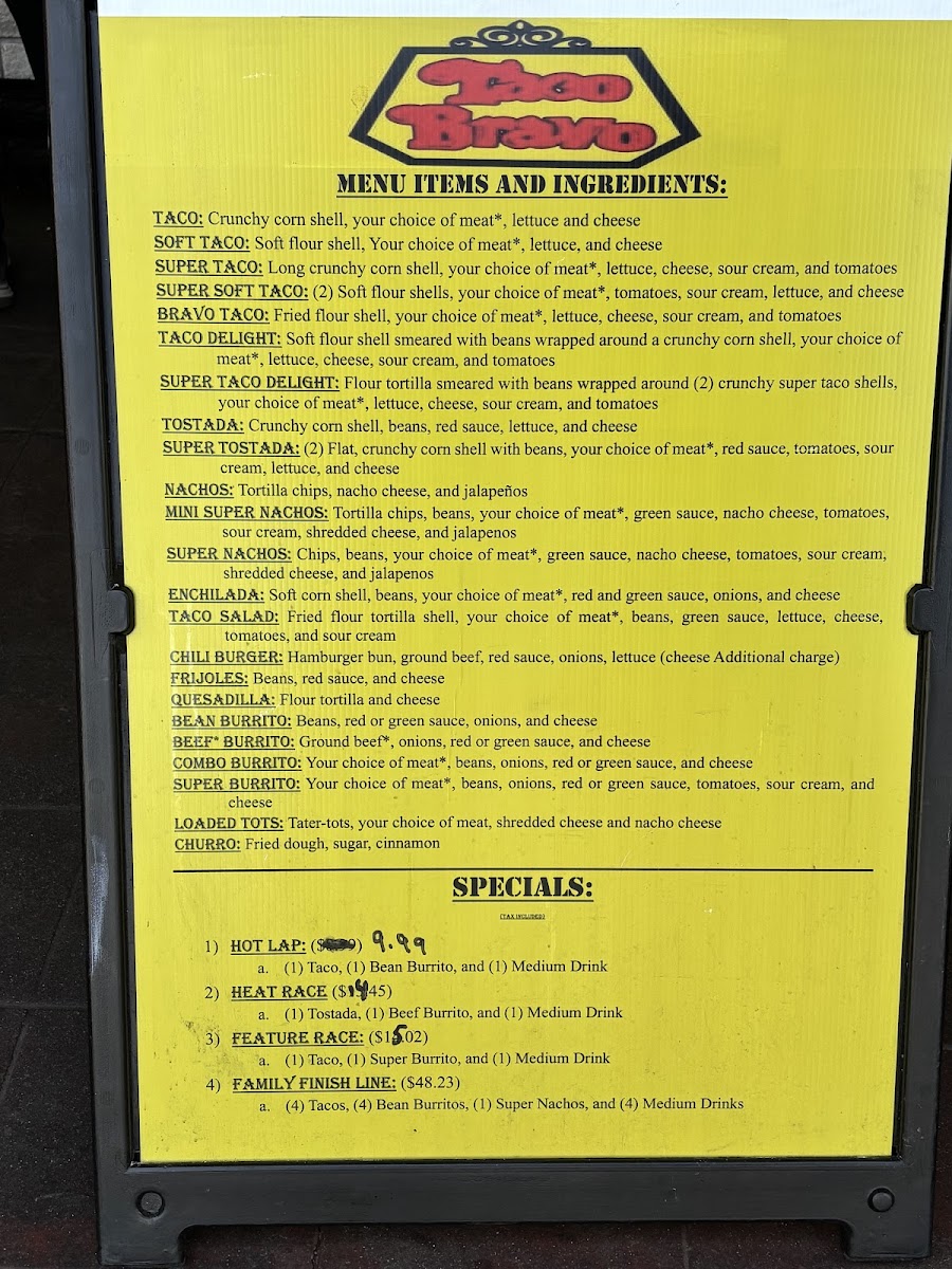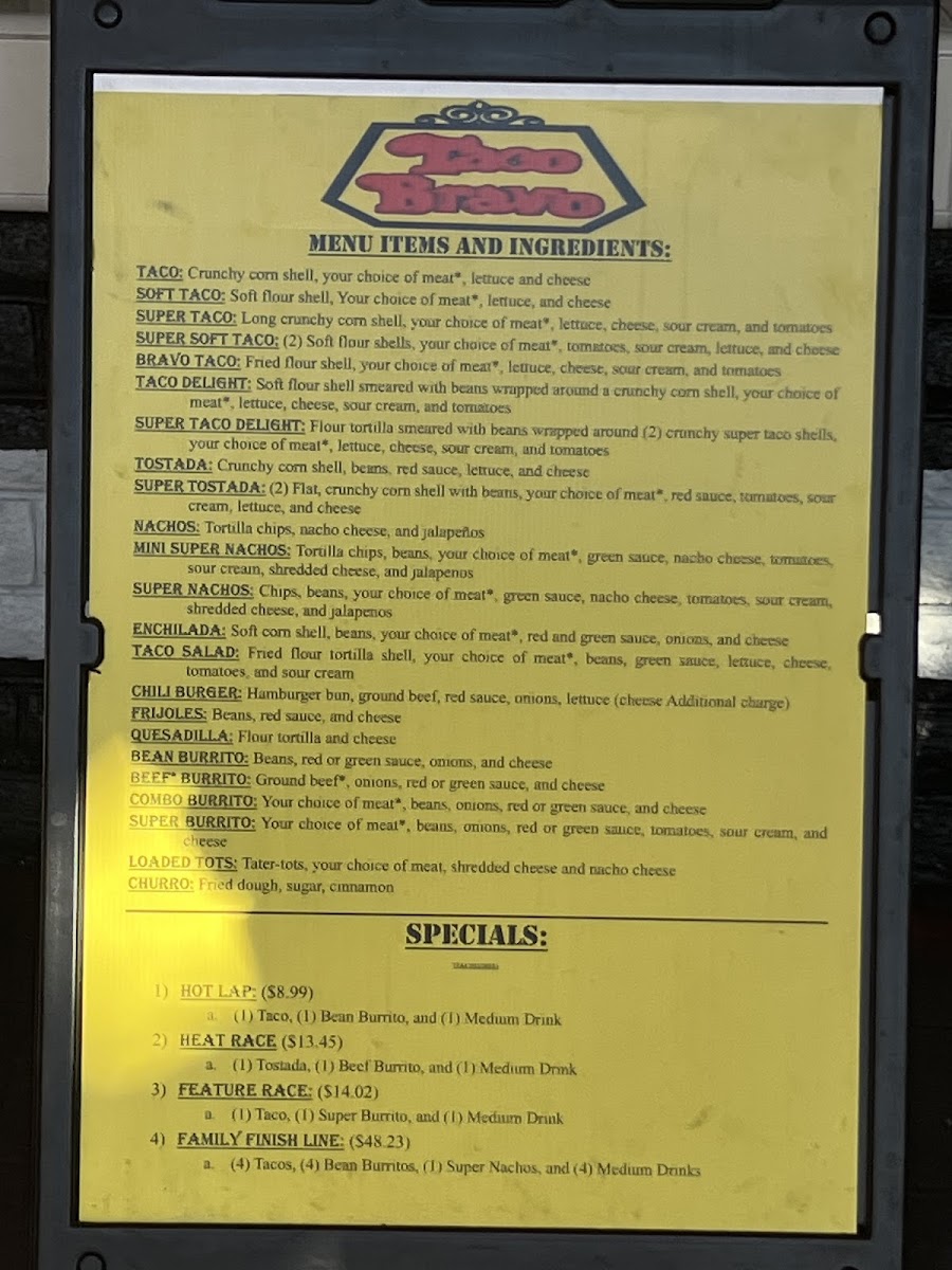 Speaking of offerings, Taco Bravo shines with a mouthwatering selection of classic favorites. Their Soft Tacos are a must-try, featuring a soft taco shell filled generously with tender beef, cheese, and crisp lettuce for just $6.25. For those willing to go big, the Super Taco Delite offers a supersized delight that combines beef, beans, fresh toppings, and a hard taco shell for just $15.99—a true fiesta on a plate!